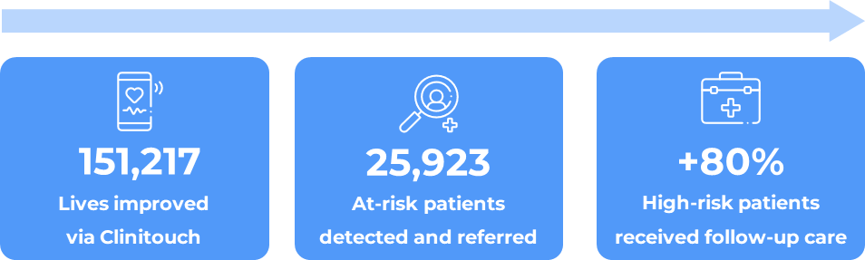 We equip frontline health workers with Clinitouch – a proven AI platform – to deliver at-home screening and monitoring, detect risks early, and ensure vital follow-up care at health centres or in homes.